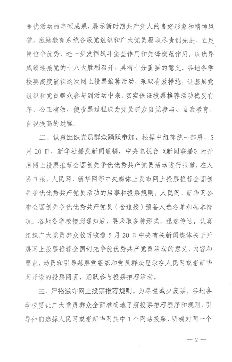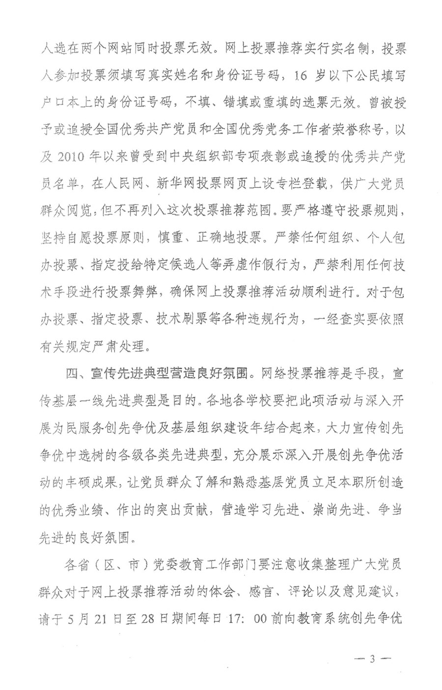 党委组织部的通知要求,5月21日至28日,中央组织部将在人民网、新华网就今年“七一”拟表彰和追授的全国创先争优优秀共产党员人选开展投票推荐活动。现将《关于组织开展好网上投票推荐全国创先争优优秀共产党员活动的通知》(教创先办发[2012]3号)转发给你们,并就有关事项通知如下:
