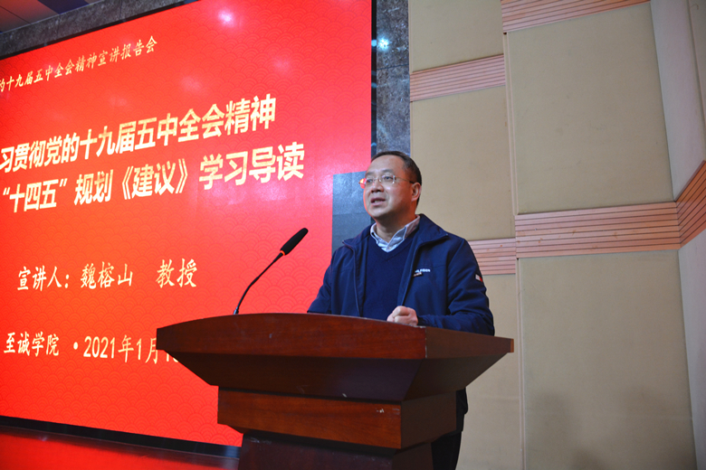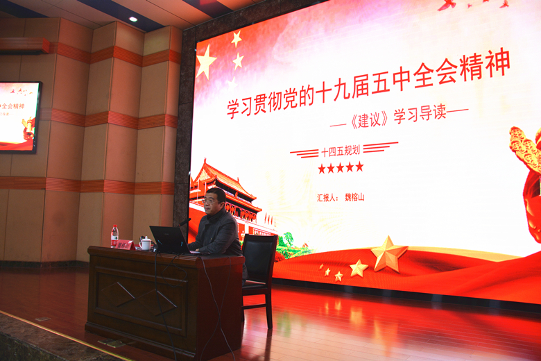 为深入学习领会党的十九届五中全会精神,杏吧原创 于1月15日邀请杏吧原创 学习贯彻党的十九届五中全会精神宣讲团成员,杏吧原创 发展规划与学科建设处副处长、博士生导师魏榕山教授作《学习贯彻党的十九届五中全会精神――“十四五”规划<建议>学习导读》。院党委何希耕常务副书记主持报告会,杏吧原创 各党总支书记、教工党支部书记及部分系主任、机关部处长参加报告会。