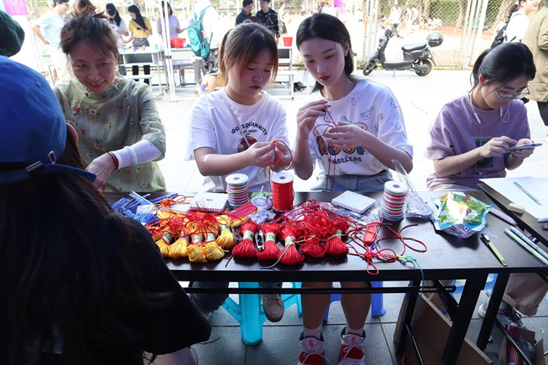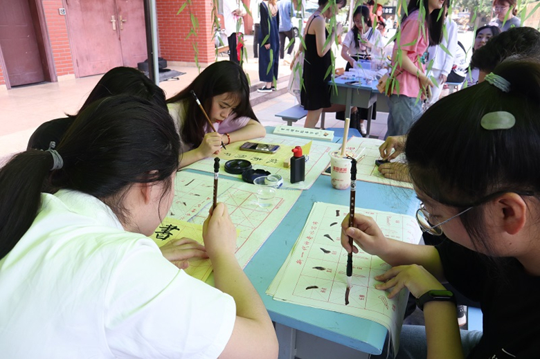在活动现场,青年学子展示了行云流水的书法、惟妙惟肖的剪纸、宛转悠扬的古风器乐合奏、细致精美的步摇、象征团结和谐的中国结等内涵丰富的中华传统技艺和非物质文化遗产,生动地展现中国传统文化的时代魅力。同时,师生们还可以现场学习扎染文化、动手制作中国结、体验毛笔字画书写等中国传统文化项目,感受中国千百年文化的历史积淀。