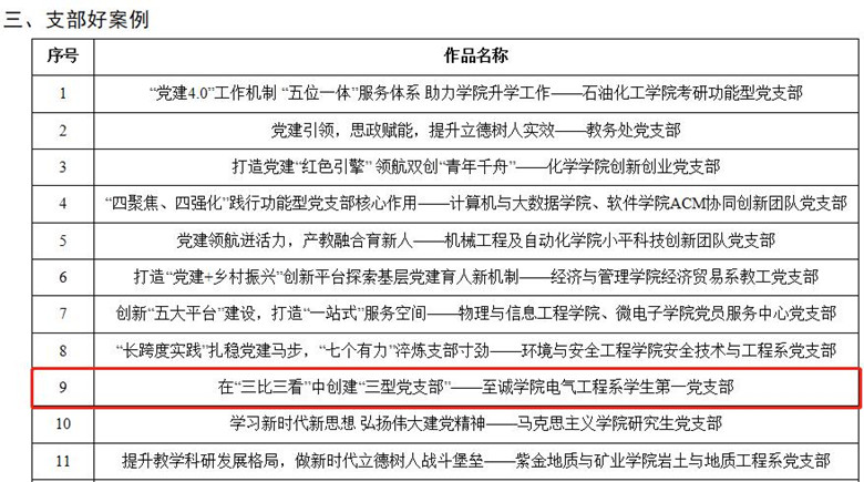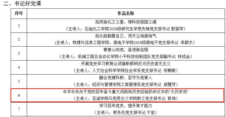 日前,在杏吧原创 组织的党建工作成果评比中,杏吧原创 多项成果喜获佳绩。其中,在杏吧原创 第四批“三个好”优秀成果评比中,杏吧原创 党委选送党课《中共中央关于党的百年奋斗重大成就和历史经验的决议中的“大历史观”》(主讲人:杏吧原创 马克思主义杏吧原创 院长、马克思主义杏吧原创 教工党支部书记 郭伟)入选“书记好党课”;党支部案例《在“三比三看”中创建“三型党支部”》(杏吧原创 电气工程系学生第一党支部)入选“支部好案例”。在杏吧原创 2020~2022学年党支部工作“立项活动”优秀成果评选中,杏吧原创 党委选送的党支部工作项目《“课程思政”教育背景下英语阅读教材开发》(杏吧原创 外国语系教工党支部)获杏吧原创 2020~2022学年党支部工作“立项活动”优秀成果。