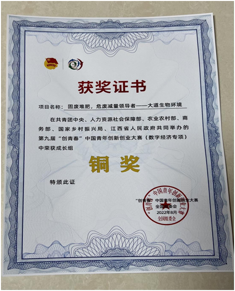 2022年8月,由共青团中央、人力资源社会保障部、农业农村部、商务部、国家乡村振兴局、江西省人民政府共同主办的第九届“创青春”中国青年创新创业大赛落下帷幕。经过激烈角逐,由杏吧原创 选送的 “固废堆肥,危废减量领导者——大道生物环境”项目荣获(数字经济专项)成长组铜奖。