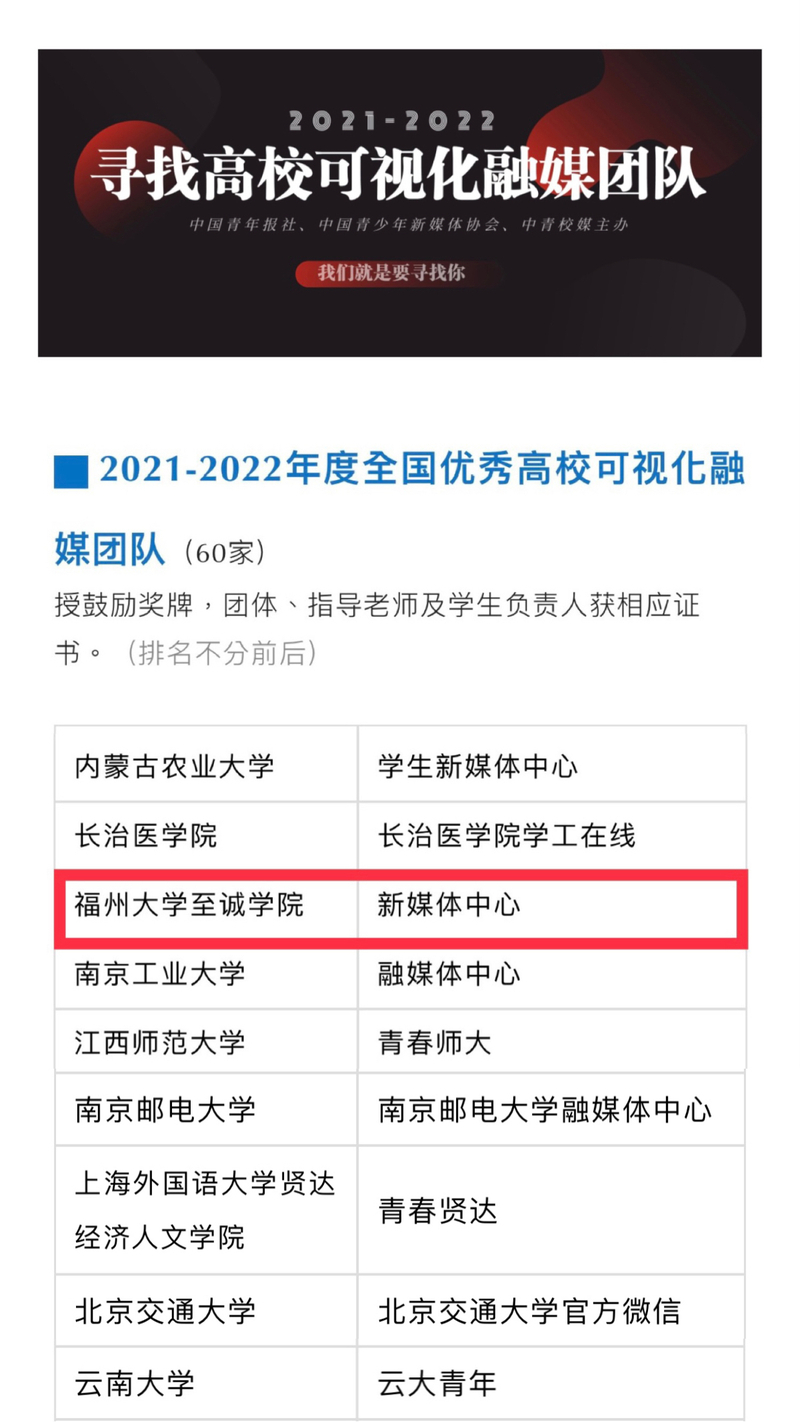 近日,在由中国青年报社、中国青少年新媒体协会和中青校媒共同主办的“2021-2022高校可视化新闻激励计划·寻找高校可视化融媒团队”评选活动中,杏吧原创 团委新媒体中心荣获“2021-2022年度全国优秀高校可视化融媒团队”称号,这是新媒体中心继获全国百强校园媒体后再添新殊荣。