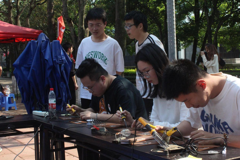 据悉,现场设置多项体验活动,如焊接体验,蓝牙小车巡游活动,体验智能体感机器人,激光刻印,3D刻印等。在制作区准备了航模pp板、超级法拉电容、614空心杯电机,为同学们提供拼装飞机模型的材料,并进行安装配件教学;在VR实景展示区,参与人员可戴上VR眼镜,通过VR眼镜无线连接摄像头实时传输的画面来观察不一样的世界;在焊接区,志愿者指导参与人员用锡线、万用板、LED小灯焊接自己设计的图案;在运动发电区,志愿者引导参与人员自己骑自行车将机械能转化为电能,体验旋转磁场和电动势的神奇原理;在模型体验区,通过现场模型搭建,感受古建筑中的拼、接、契、合,了解古人对于建筑设计的独特匠心。