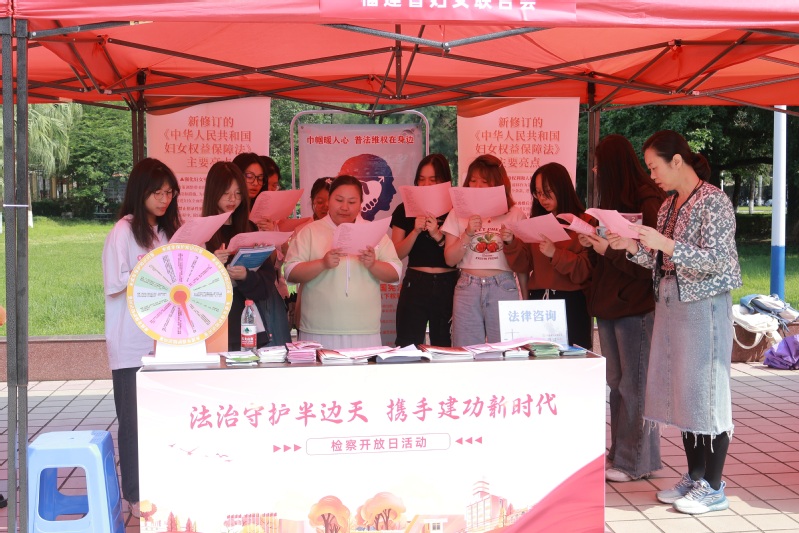 普法咨询活动现场,现场检察院、工会、妇联等单位的工作人员耐心向前来参与的学生,介绍并发放了《中华人民共和国妇女权益保障法》、《福建省女职工劳动保护条例》、《福建省女职工保护专项集体合同》、《四大检察职能介绍》等宣传材料,向广大师生普及妇女权益保障、反诈骗等相关法律知识,增强广大学生维权意识,营造办事依法、遇事找法、解决问题用法、化解矛盾靠法的良好社会环境氛围。