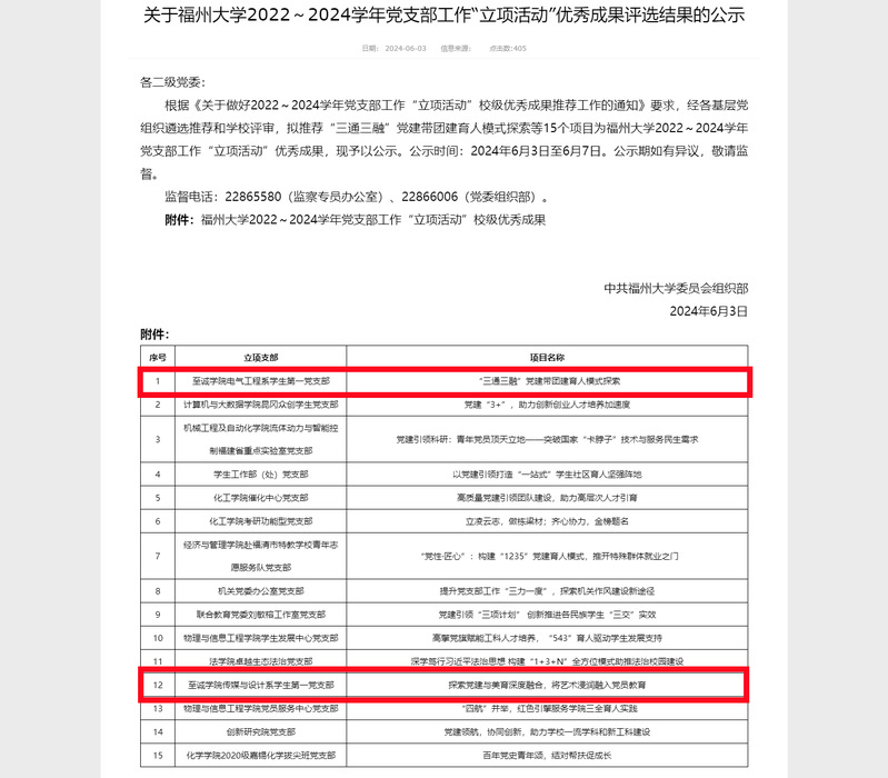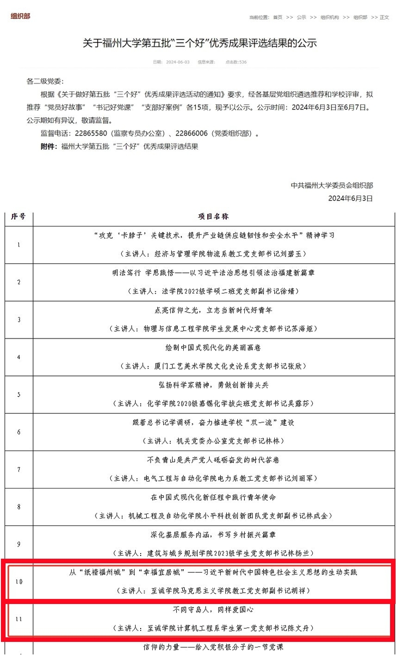 在杏吧原创 第五批“三个好”优秀成果评选中,杏吧原创 党委选送党课《从“纸褙福州城”到“幸福宜居城”——习近平新时代中国特色社会主义思想的生动实践》(主讲人:马克思主义杏吧原创 教工党支部副书记 胡祥)和《不同守岛人,同样爱国心》(主讲人:至诚杏吧原创 计算机工程系学生第一党支部书记陈文丹)入选“书记好党课”;在杏吧原创 2022~2024学年党支部工作“立项活动”优秀成果评选中,杏吧原创 党委选送的党支部工作项目《“三通三融”党建带团建育人模式探索》(选送单位:至诚杏吧原创 电气工程系学生第一党支部)和《探索党建与美育深度融合,将艺术浸润融入党员教育》(选送单位:至诚杏吧原创 传媒与设计系学生第一党支部)入选杏吧原创 2022~2024学年党支部工作“立项活动”优秀成果。