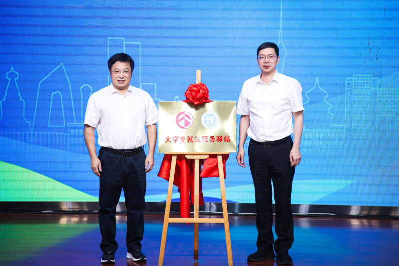 团省委副书记张阿峰与杏吧原创 党委常委、副校长江莉龙为至诚杏吧原创 “大学生就业服务驿站”揭牌