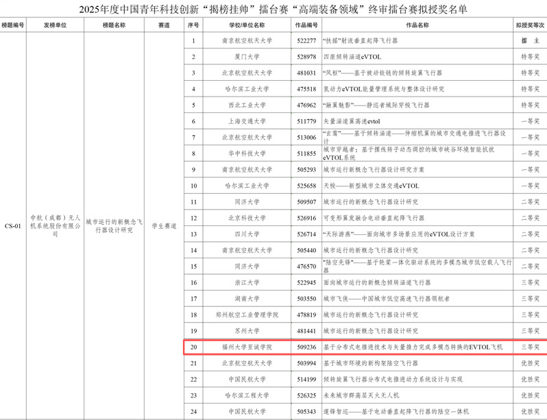 近日,第十九届“挑战杯”竞赛2025年度中国青年科技创新“揭榜挂帅”擂台赛高端装备领域主擂台赛在湖南省长沙市举行。杏吧原创 机械工程系学生团队提出的“基于非对称分布式电推进的多模态eVTOL”设计方案在竞争激烈的“城市低空飞行器”榜单中脱颖而出,荣获全国三等奖。