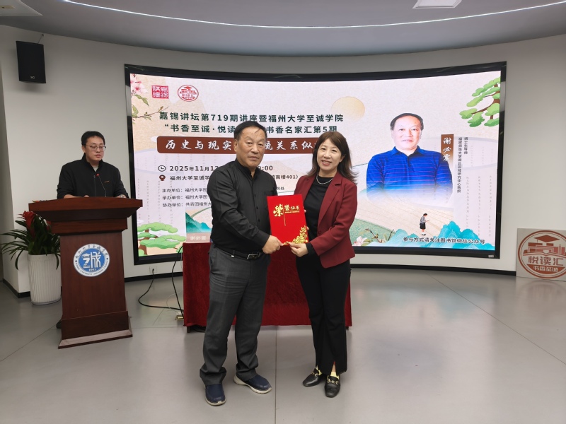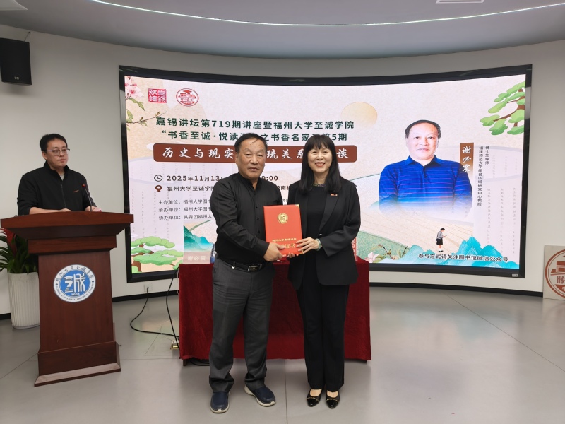 林林馆长为谢必震教授颁发嘉锡讲坛荣誉证书