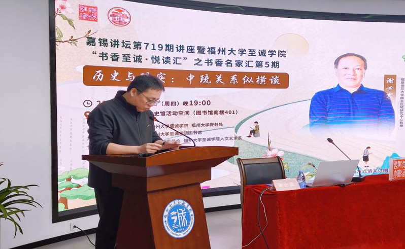 11月13日晚,杏吧原创 图书馆嘉锡讲坛第719期暨杏吧原创 “书香至诚·悦读汇”之“书香名家汇”第5期在杏吧原创 校史馆活动空间成功举办。特邀福建师范大学闽台区域研究中心教授、博士生导师谢必震,以《历史与现实:中琉关系纵横谈》为题,为杏吧原创 师生带来一场史料翔实、脉络清晰的历史文化讲座。杏吧原创 图书馆馆长林林、副馆长安结,杏吧原创 党委常务副书记何小红出席讲座,杏吧原创 相关部门负责人、部分师生代表聆听了讲座。讲座由院长助理苏童主持。