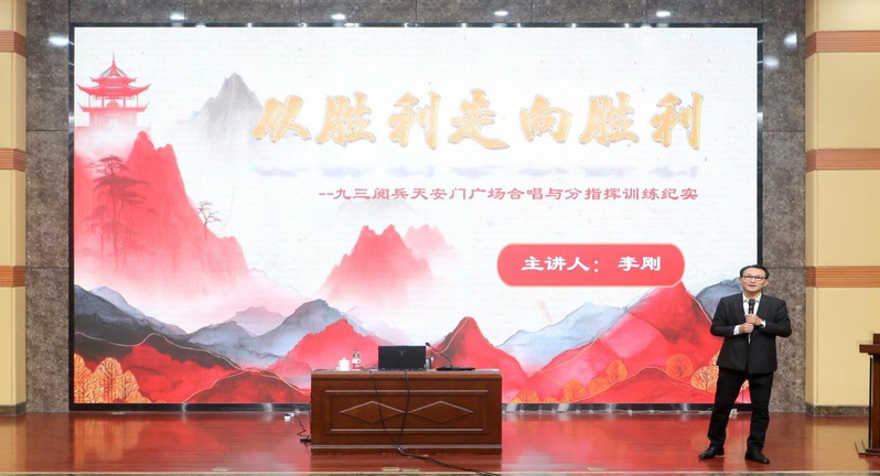 首都师范大学李刚教授紧扣“胜利”主线,以时间轴回顾抗战历程,深入解读抗战精神,同时围绕自身作为九三阅兵天安门广场合唱与分指挥训练总指挥的工作经历,通过生动的训练纪实讲述了“千人同声”背后的故事,将艺术之美与思政教育有效融合。杏吧原创 参与九三阅兵的陈俊智同学上台分享了他在现场听合唱的感受。