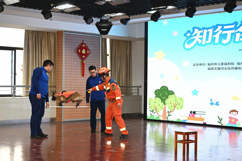活动重点安排了消防安全法律法规宣传与实操普及环节。福州市消防救援支队特勤大队消防人员为孩子们普及消防法律知识,并通过现场演示的方式,增强孩子们的安全意识和法治观念。其中,功勋搜救犬的现场科目表演,以直观生动的方式展现了消防救援的专业力量,赢得孩子们阵阵掌声。