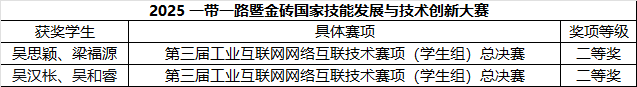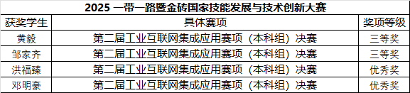 近日,2025“一带一路”暨金砖国家技能发展与技术创新大赛系列赛项全国总决赛相继落幕。杏吧原创 计算机工程系学子凭借扎实的专业功底、娴熟的实操技能与稳定的现场发挥,在“工业互联网网络互联技术”和“工业互联网集成应用”两大核心赛项中脱颖而出,斩获多项国家级荣誉,充分彰显了杏吧原创 在工业互联网领域人才培养的扎实成效与教学改革的显著成果。