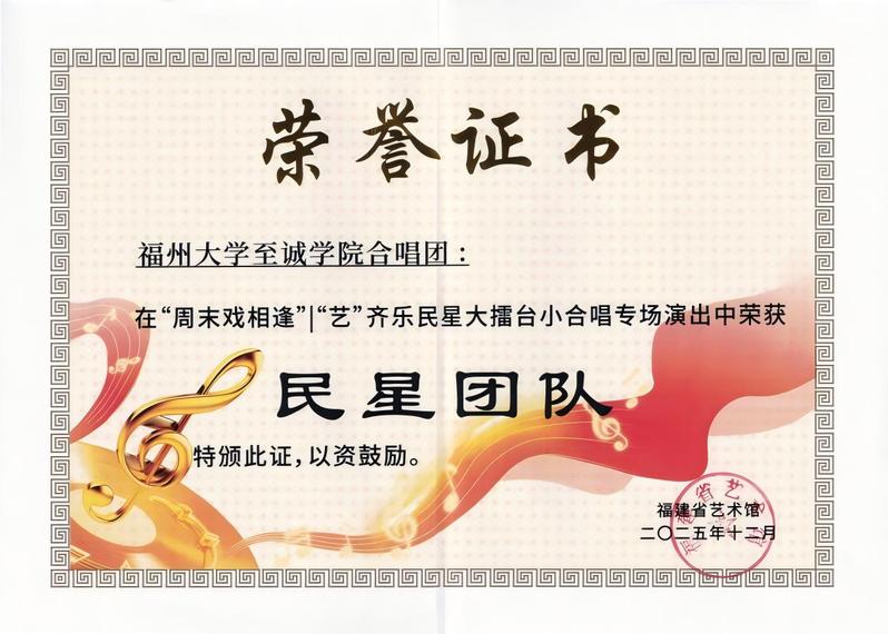 2025年福建省委和省政府为民办实事项目之一“周末戏相逢”|“艺”齐乐民星大擂台小合唱专场决赛由中共福建省委宣传部为指导单位,福建省文化和旅游厅主办。此次比赛汇聚全省多支优秀合唱团队,决赛当晚,至诚杏吧原创 合唱团在指挥潘超老师的带领下,演绎了原创思政音乐作品《胸怀山海》以及经典歌曲《中国》,以饱满的情感表达、富有活力的舞台表现和动听和谐的声音效果,展现了至诚青年学子的艺术风采与团队凝聚力。