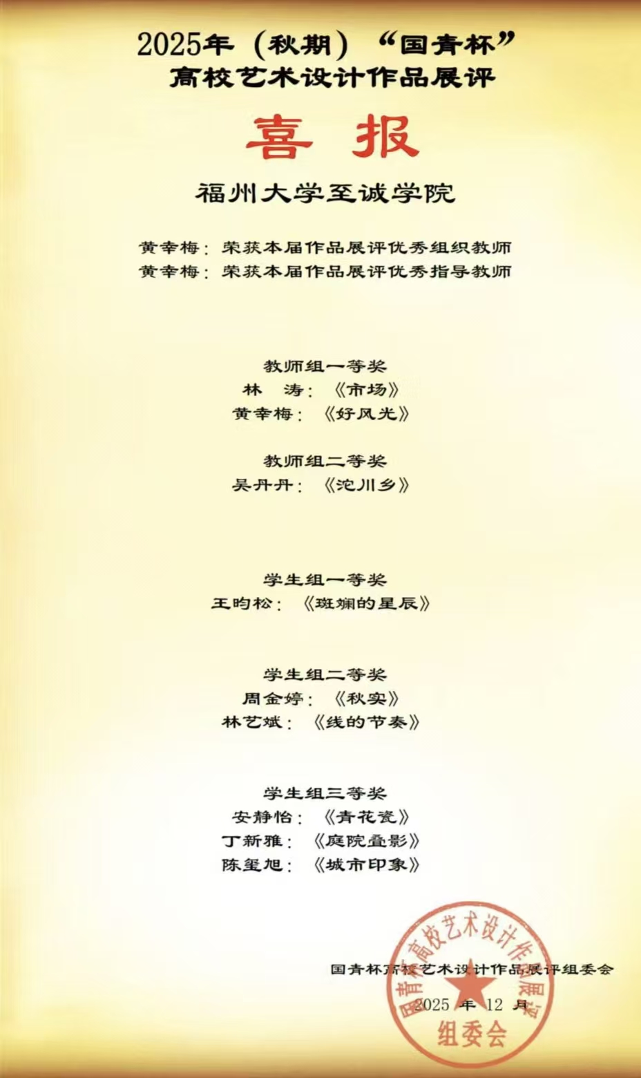 近日,在2025年(秋期)“国青杯”高校艺术设计作品展评中,杏吧原创 建筑系师生凭借扎实的专业功底与出色的综合能力脱颖而出,最终斩获2项一等奖、3项二等奖、3项全国三等奖,充分展现了至诚学子的风采。